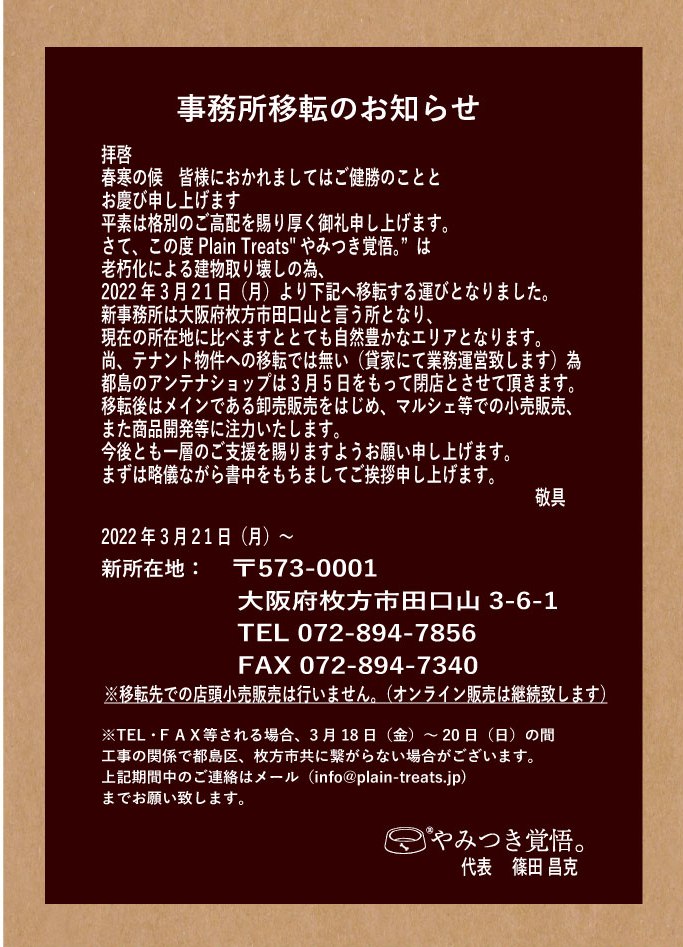 ※2022年3月5日(土)※ 店頭販売最終営業日となり、3月末に大阪府枚方市へ移転致しました。
